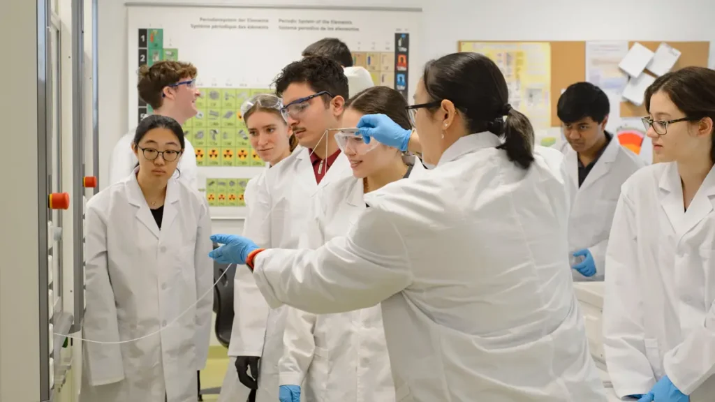 Six subject groups — Language & Literature (English, German), Language Acquisition (German, Spanish, French, English), Individuals & Societies (History, Business, Geography), Sciences (Biology, Physics, Environmental Systems and Societies, Sports Exercise and Health Science), Mathematics (Analysis and Approaches, Applications and Interpretations), Arts & Electives (Visual Arts, Music, Chemistry, Psychology, Computer Science) — taken at Standard or Higher Level depending on student focus. Interdisciplinary connections foster deeper understanding and real-world application.